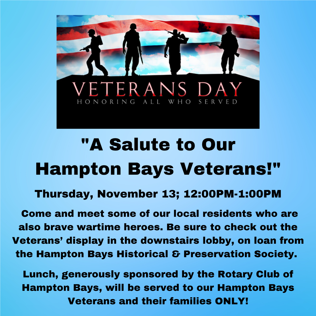 Please invite the Veterans in your life to our annual Veterans Day sponsored luncheon at the Hampton Bays Library. (Lunch is for the vets only!) You or your invited Vets should RSVP to Donna Valle at (631) 728-6241